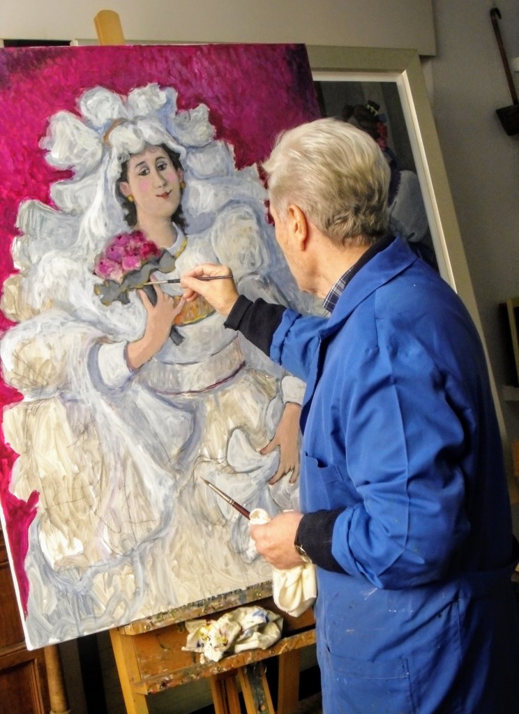 Ángel Pina Nortes empezó su recorrido pictórico hace ya más de medio siglo con tan solo 14 años y él mismo se describe como un pintor impresionista, pero de estilo propio y creador. También se declara costumbrista, con sus reconocidas figuras por sus característicos mofletes rojizos.