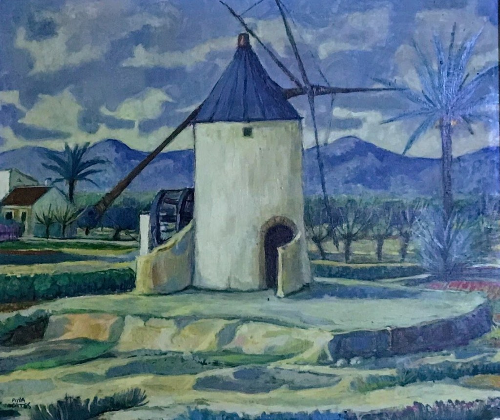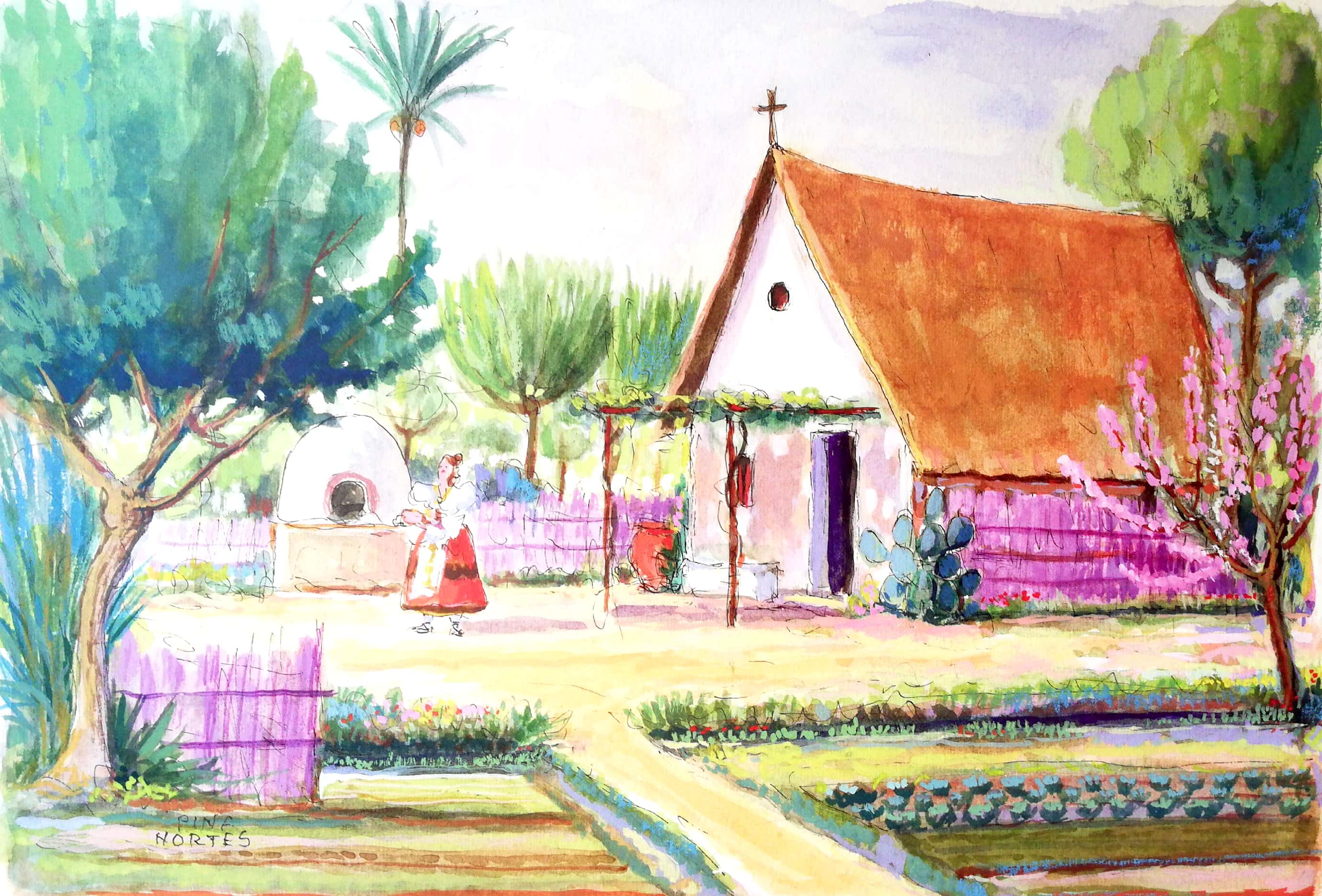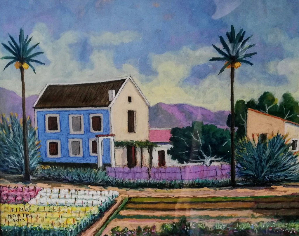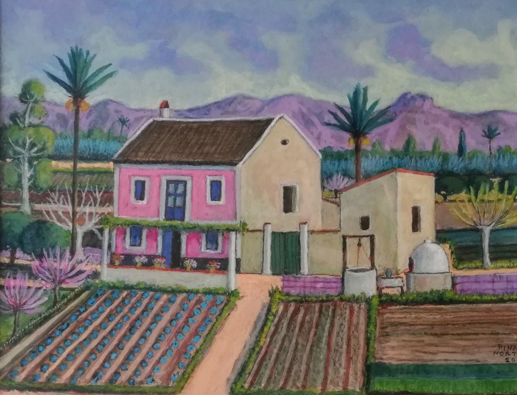 A través de su paleta de colores vivos y su técnica meticulosa, Pina Nortes recrea la esencia y la riqueza visual de la huerta murciana y logra transmitir la belleza única de la Región de Murcia, reflejando los paisajes huertanos y la vida cotidiana de la gente de la Región de Murcia.