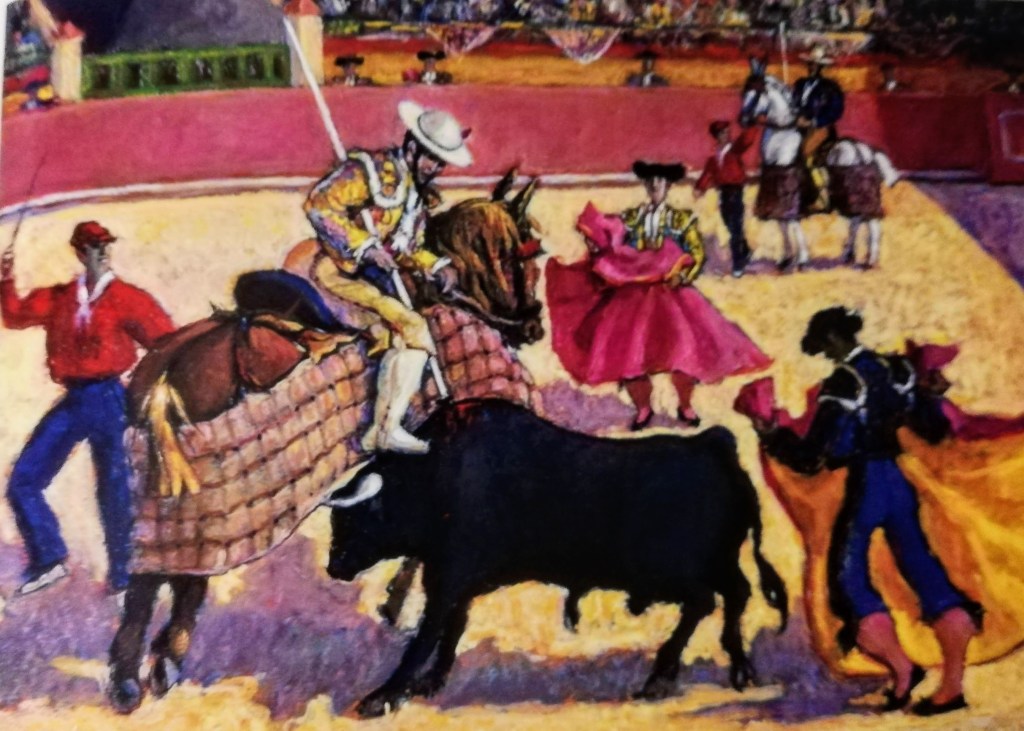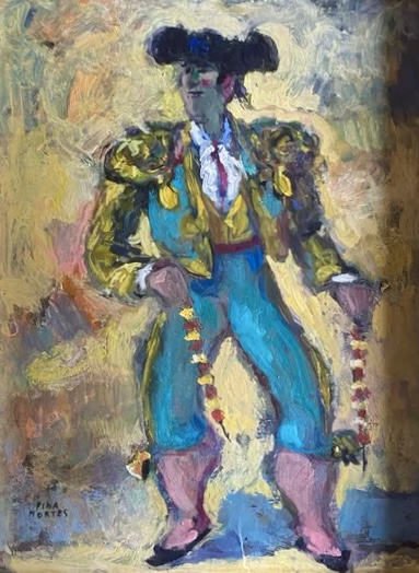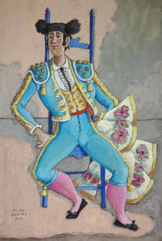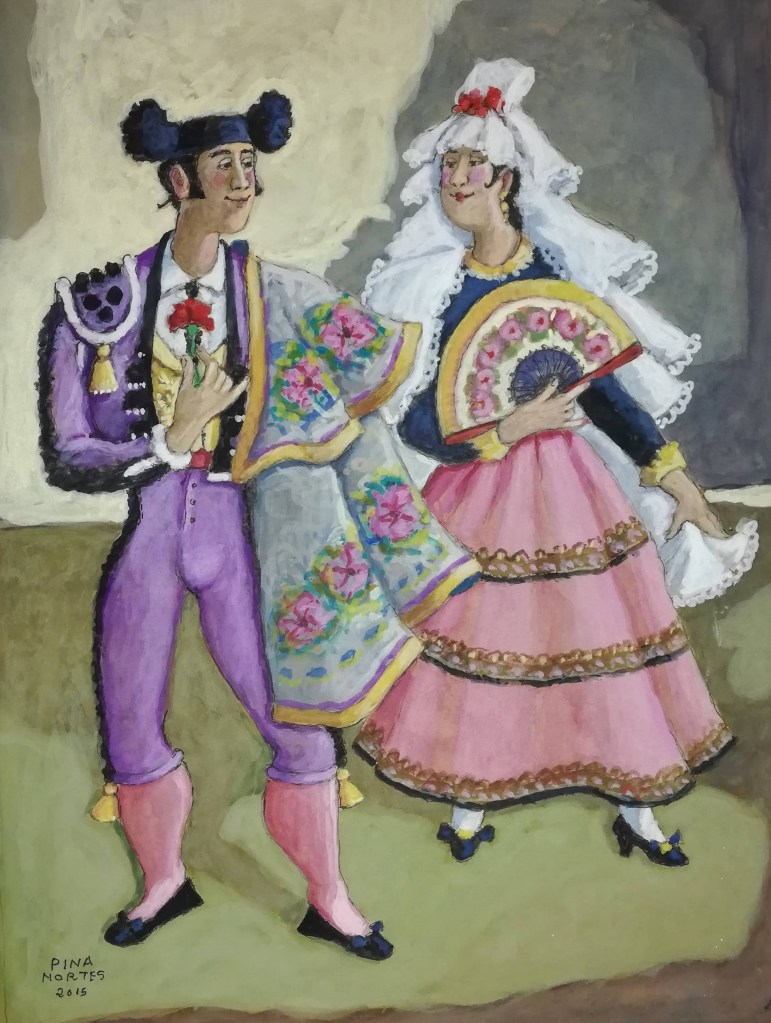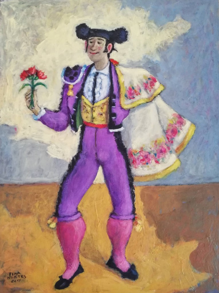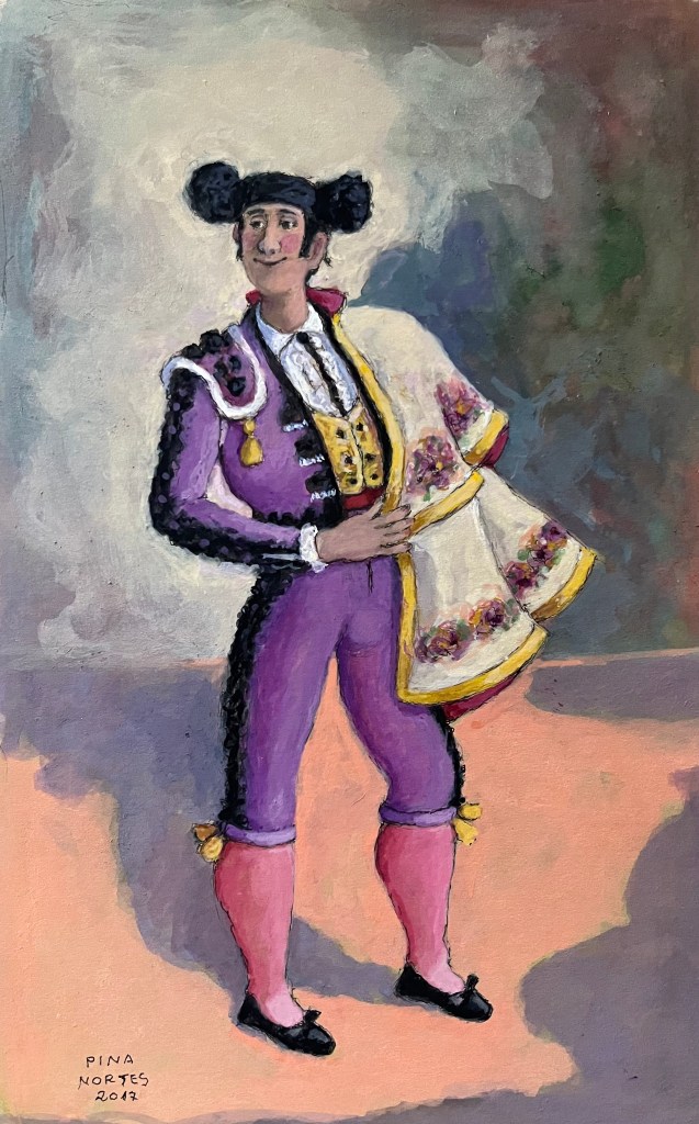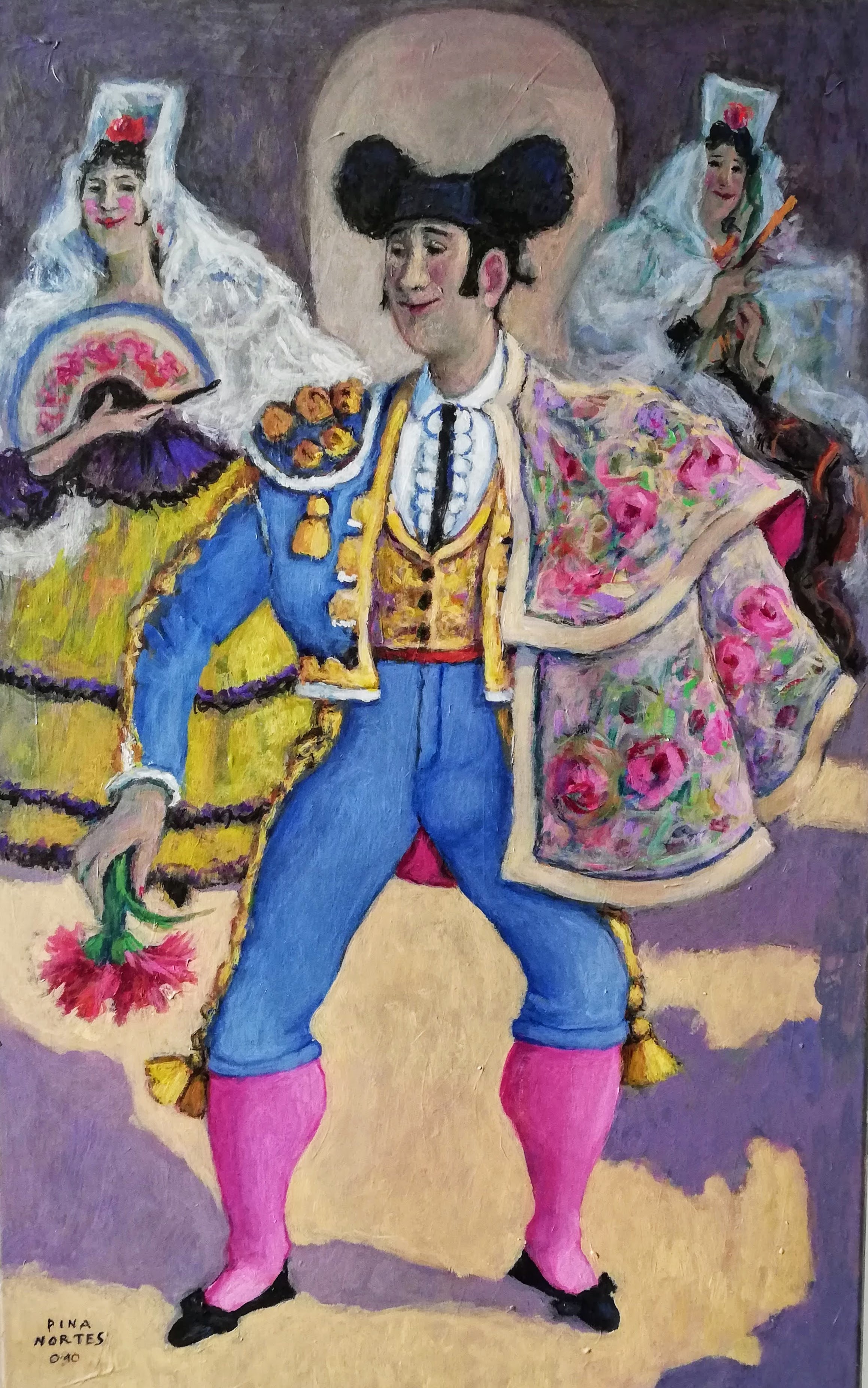 Ángel Pina Nortes, con su encanto pintoresco y la vibrante alegría de una paleta colorida, captura la esencia festiva con elementos costumbristas en sus cuadros. Sus obras, centradas en personajes festivos, son auténticas creaciones que reflejan el tipismo y dan vida a escenas de la tauromaquia, donde las Manolas, toreros y picadores destacan con gracia, vitalidad y evitando situaciones cruentas y traumáticas.