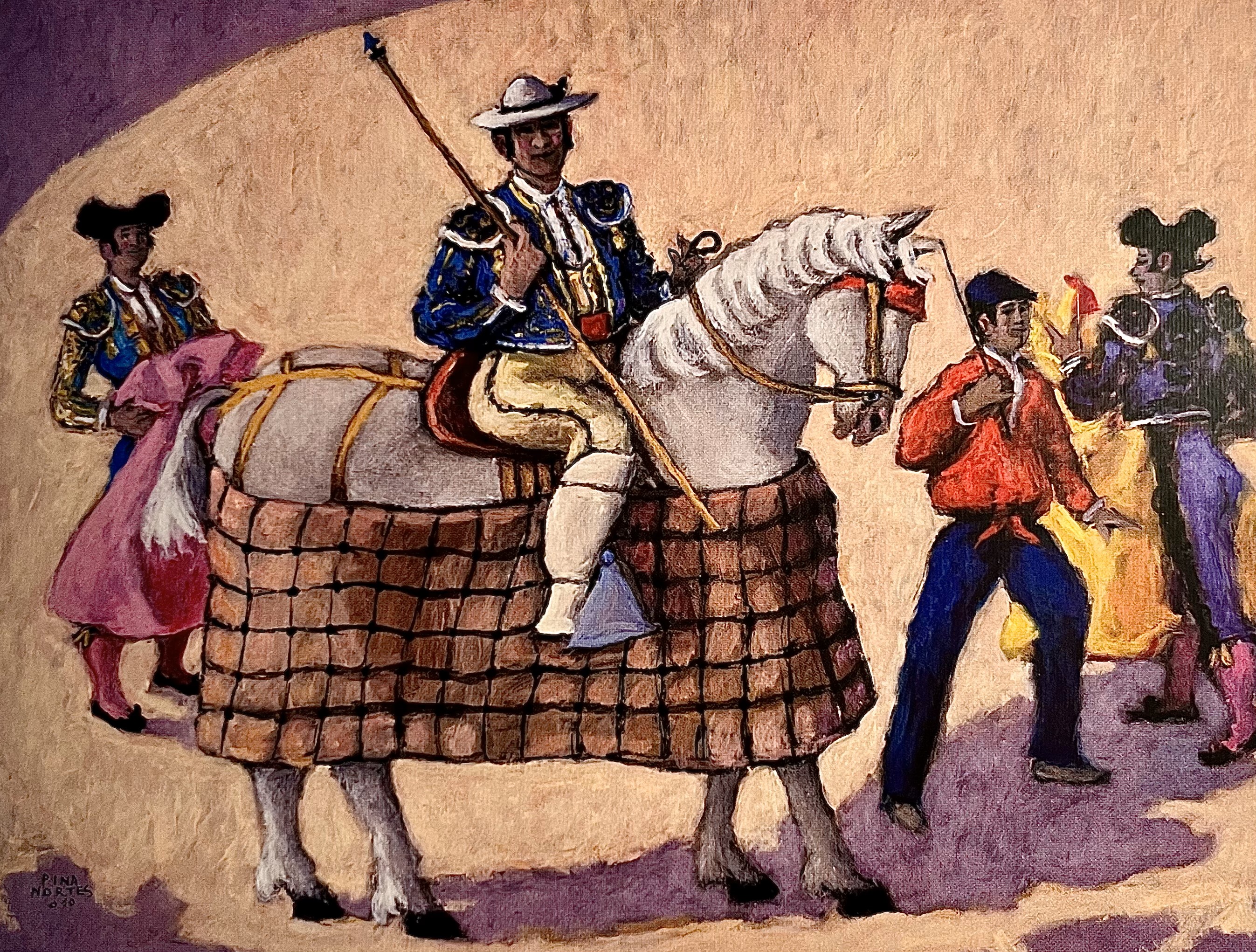 Desde su idílica representación y alegre interpretación de lo murciano, Ángel Pina Nortes nos brinda una tauromaquia personal, jugosa y llena de color, similar a sus bodegones, así como sencilla y popular como los paisajes de la huerta. En resumen, es un canto a los personajes que él considera como los verdaderos representantes de la fiesta.